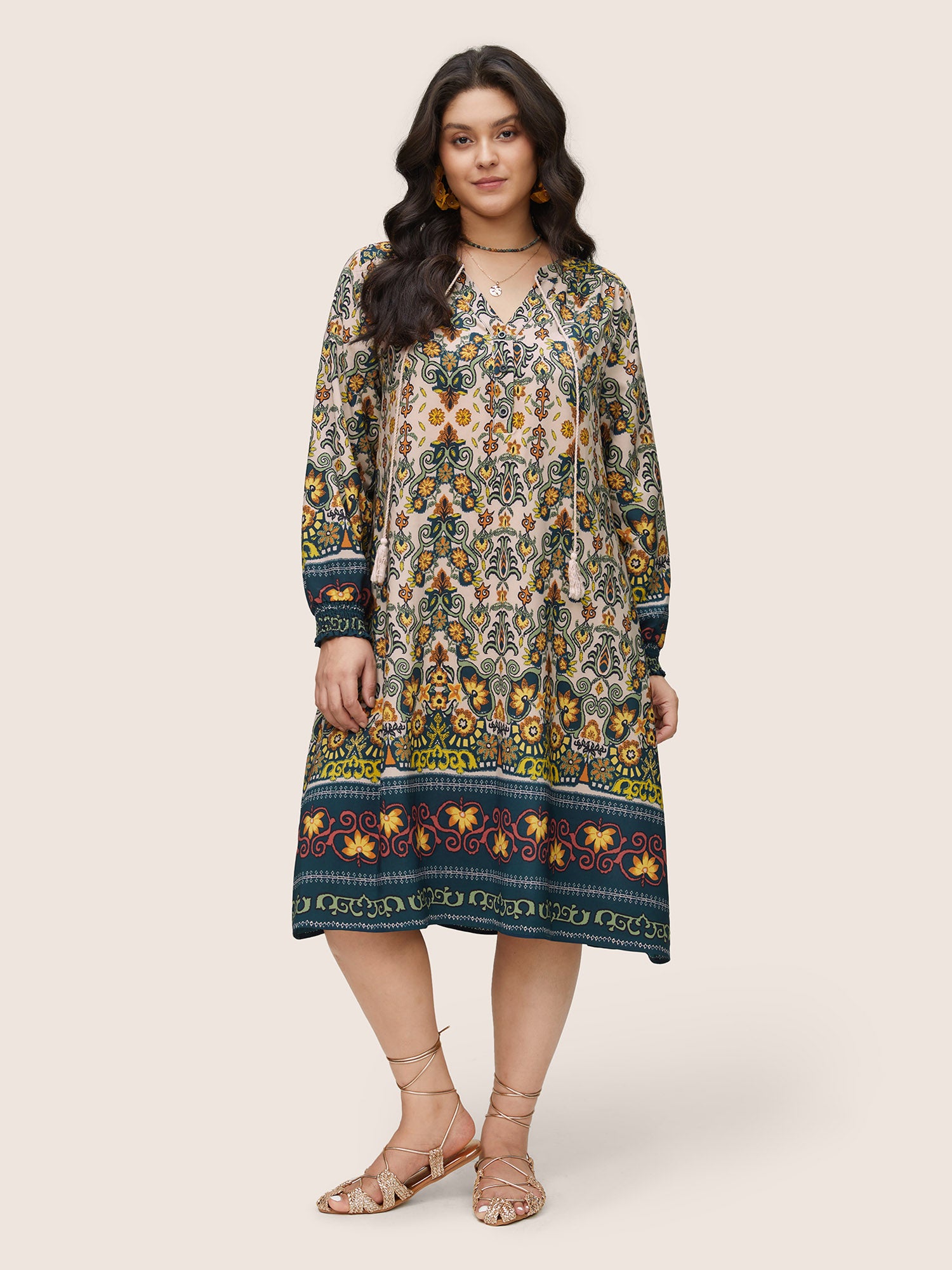 Bandana Print Ruffles Lantern Sleeve Pocket Tassels Tie Neck Dress$5.90 USD$35.90 USDDescribe your product
