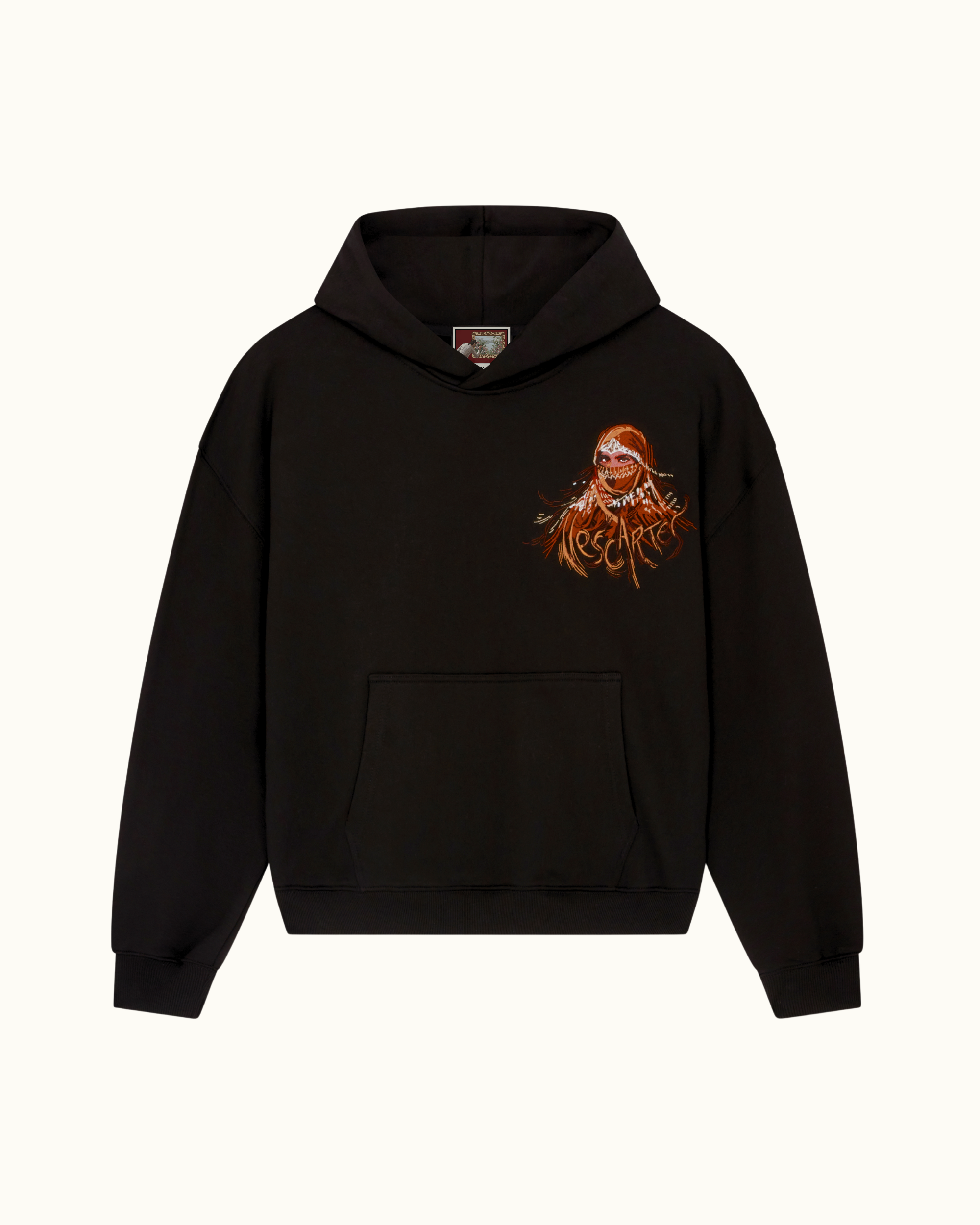 The Arima Hoodie is crafted from heavyweight 400GSM organic cotton in a deep, pure black finish. Intricate embroidery brings the garment to life, telling a visual story rooted in Arabic and oriental heritage. Features a mysterious veiled figure on the chest and an expansive marketplace scene on the back.