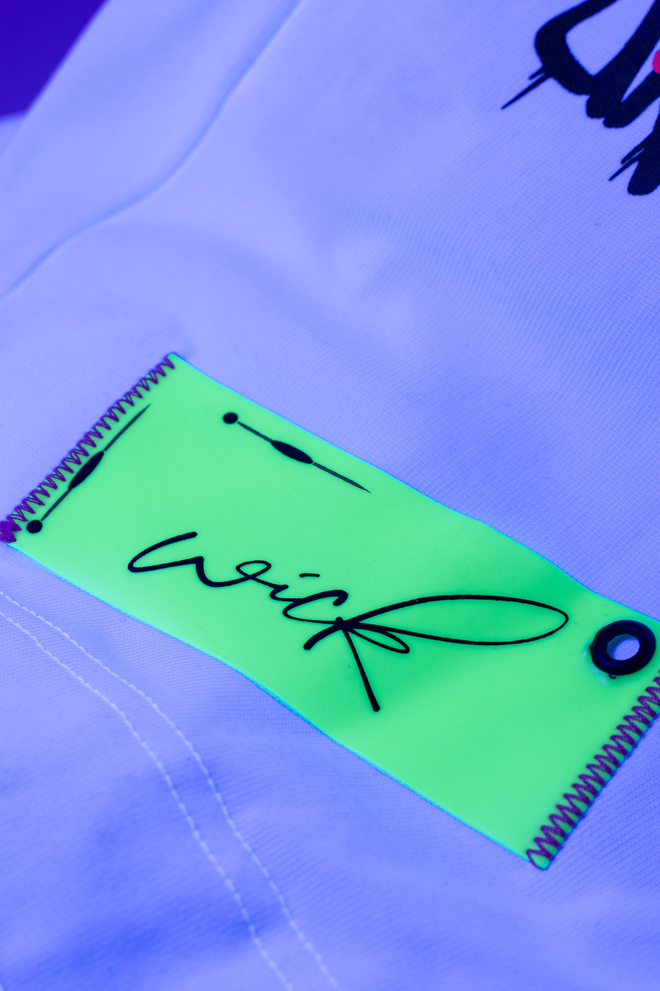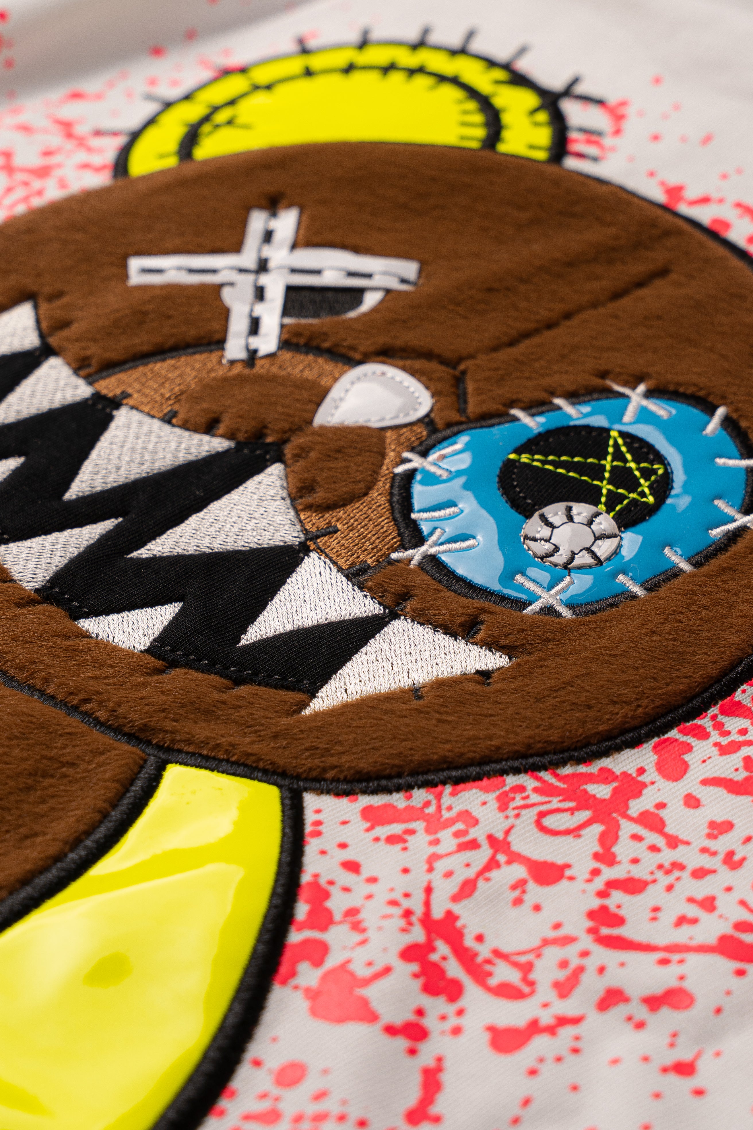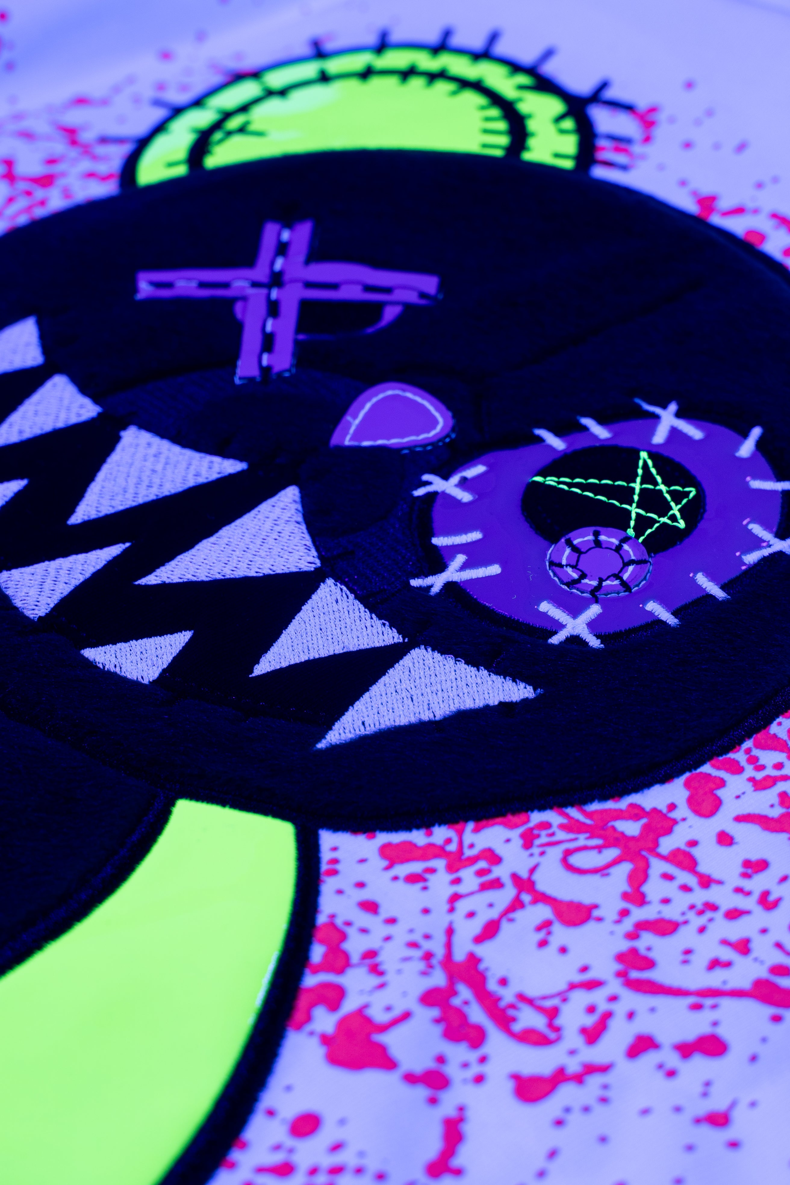 Let your inner monster run wild with the Oversized NR White Bear Tee from Wick Monsters. This tee features a neon-splattered, stitched-up bear with attitude, ready to rule the streets (and the night). Pink, yellow, and blue pops come alive under UV light, making every move a statement. Whether you’re on the festival grounds or just vibing with your crew, this tee shouts “Awaken your inner monster” in the coolest way .Glow in the dark and on UV light
