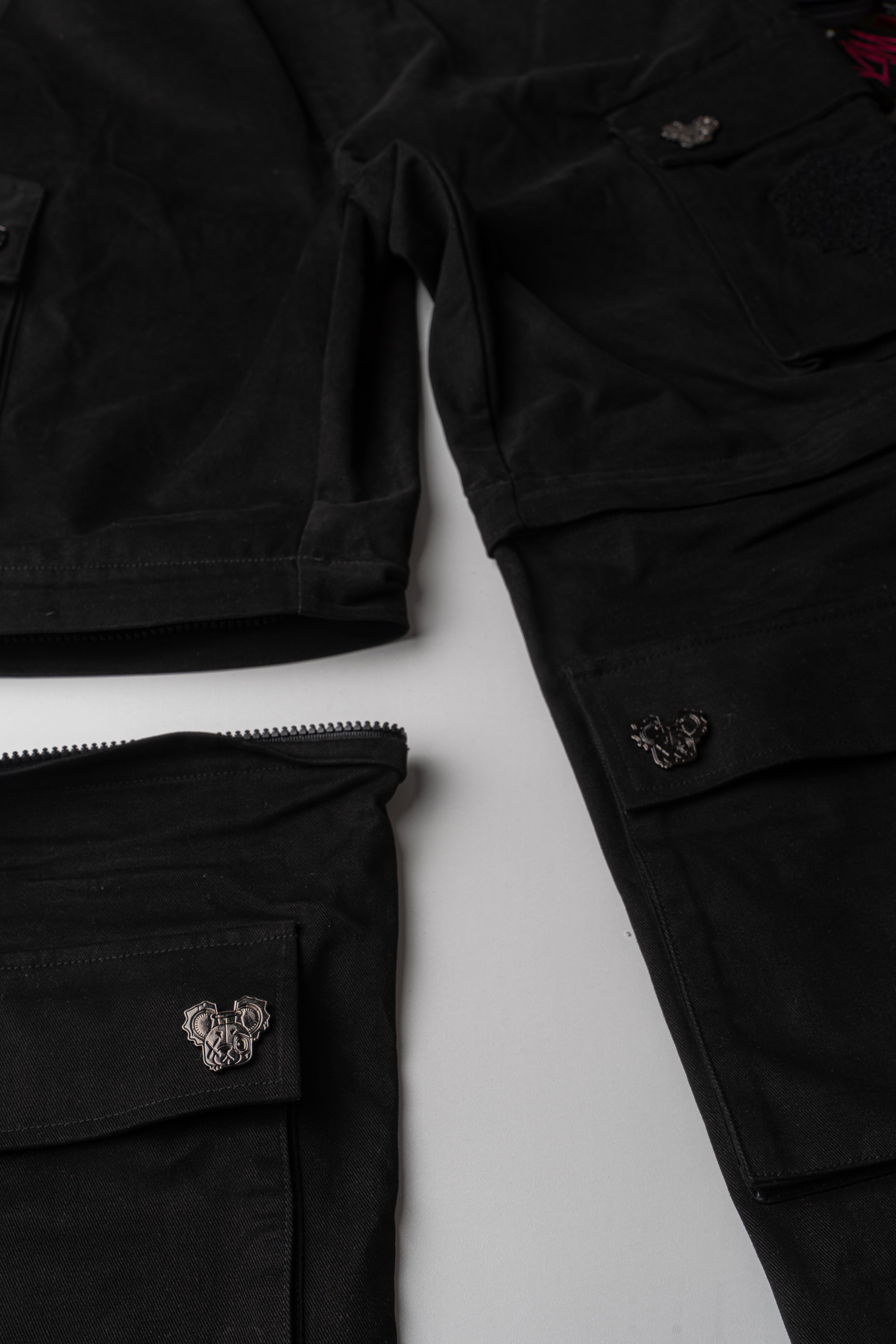 Crafted from 100% cotton, these pants convert into shorts with a hidden zipper. They feature interchangeable patches in yellow, yellow-black, and grey, plus removable Yellow straps at the bottom for added flair. Finished with steel buttons engraved with the Wick face and a custom keychain attached to the belt loops. Designed for bold style and maximum versatility.