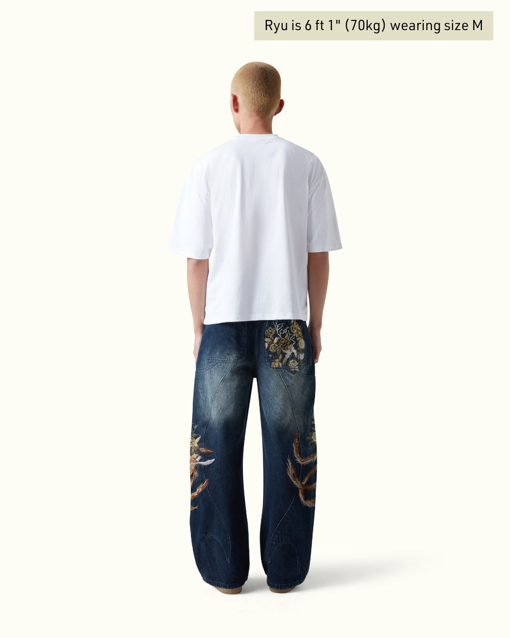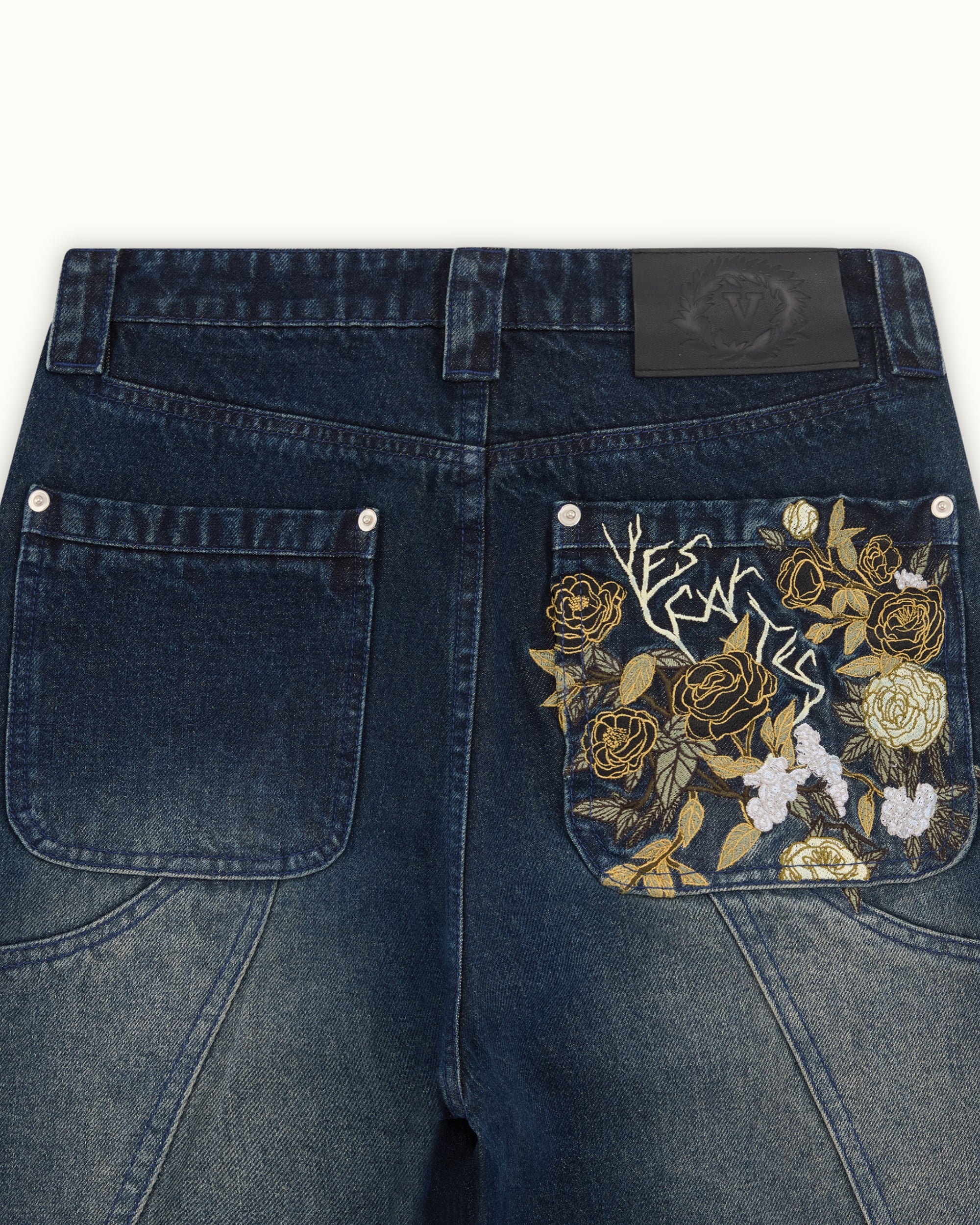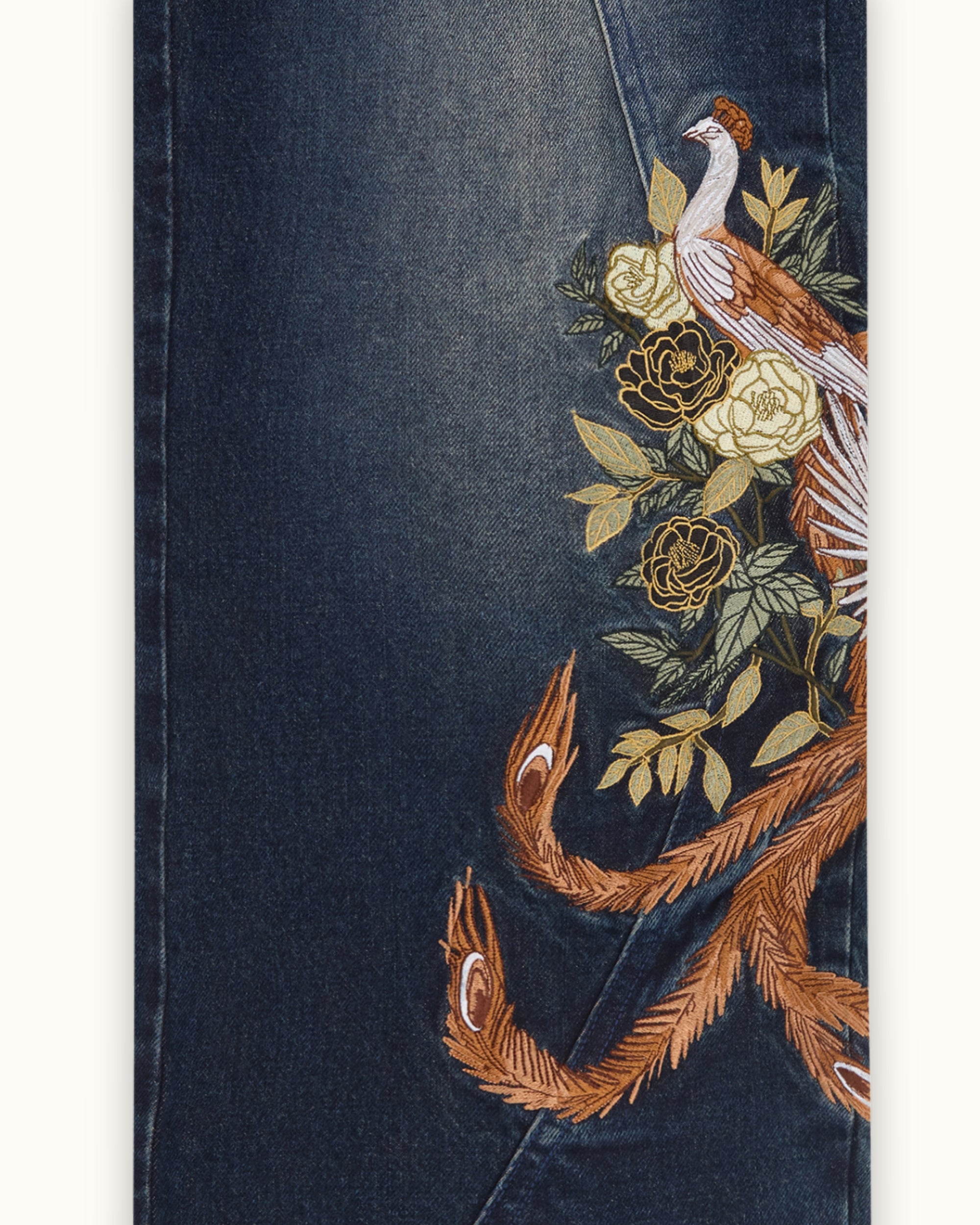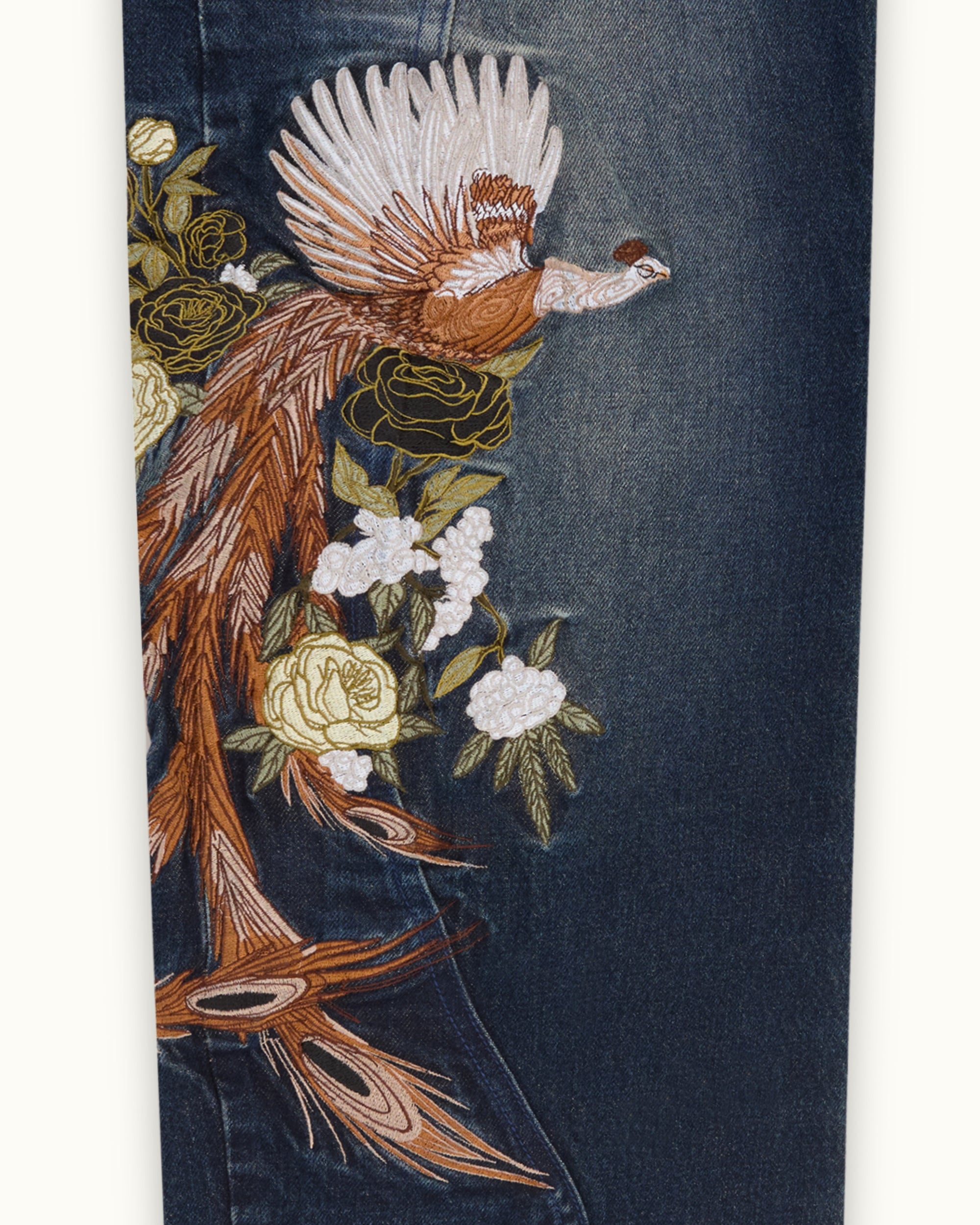 The Eden Denim is cut from heavyweight organic cotton in a deep indigo wash. Detailed peacock and rose embroidery covers each leg, amassing to over 800,000 stitches, with a fully embroidered back pocket hiding the Vescartes name. Finished with custom panelling and premium branded hardware.