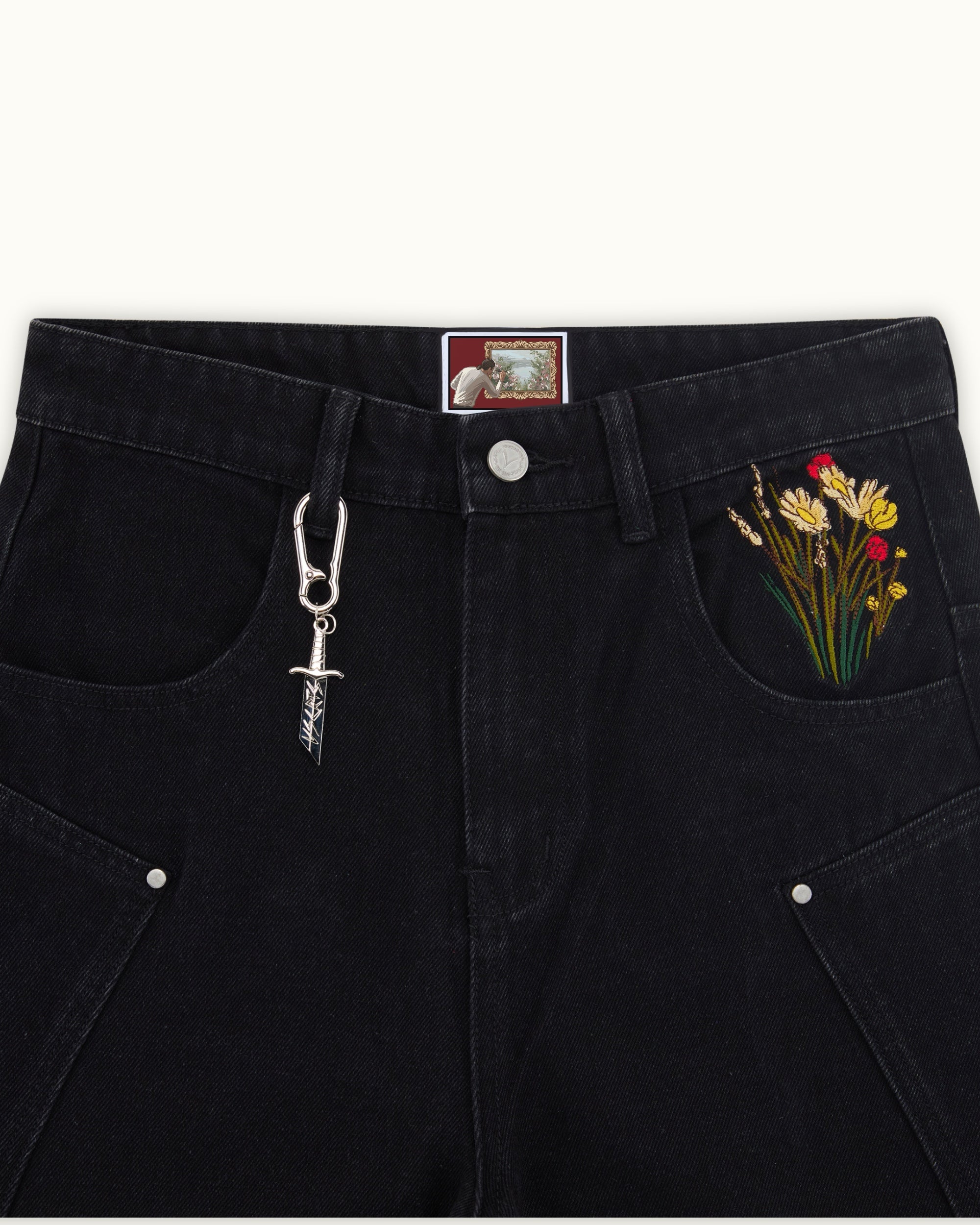 Cut from pure black denim with custom panelling and metal rivet detailing. Back pocket embroidery of a medieval knight resting on a vibrant bed of flowers, with contrasting silver armour and red accents with rich green, yellow, and red blooms. Finished with a debossed leather tab and engraved sword carabiner.