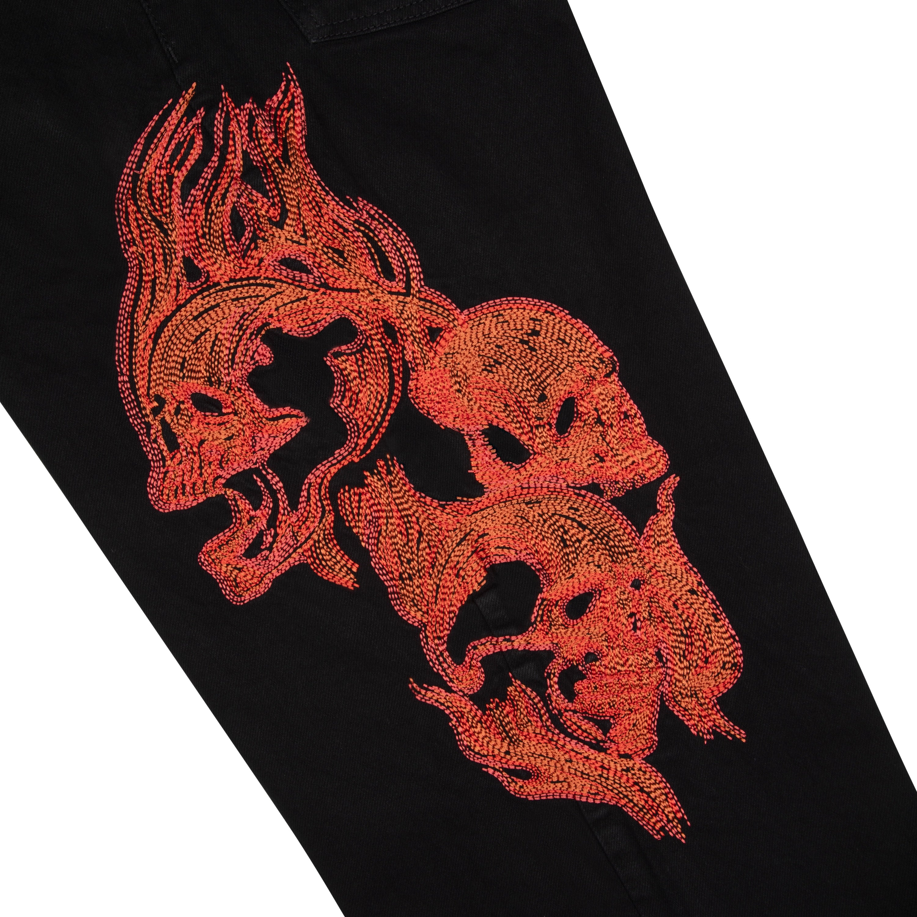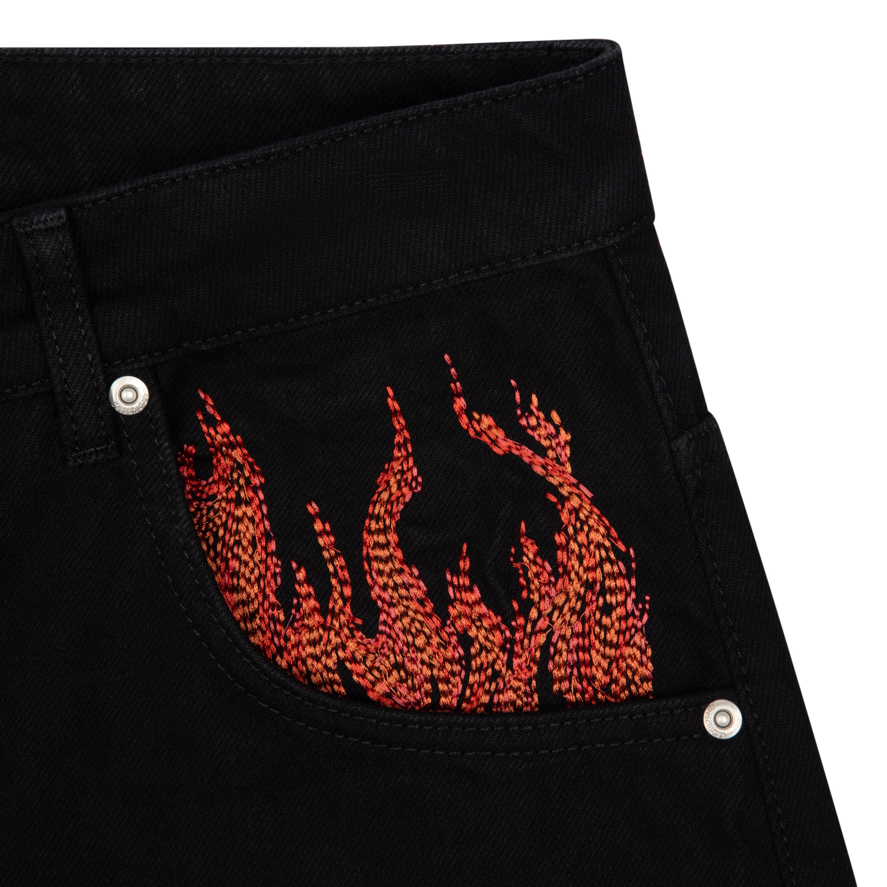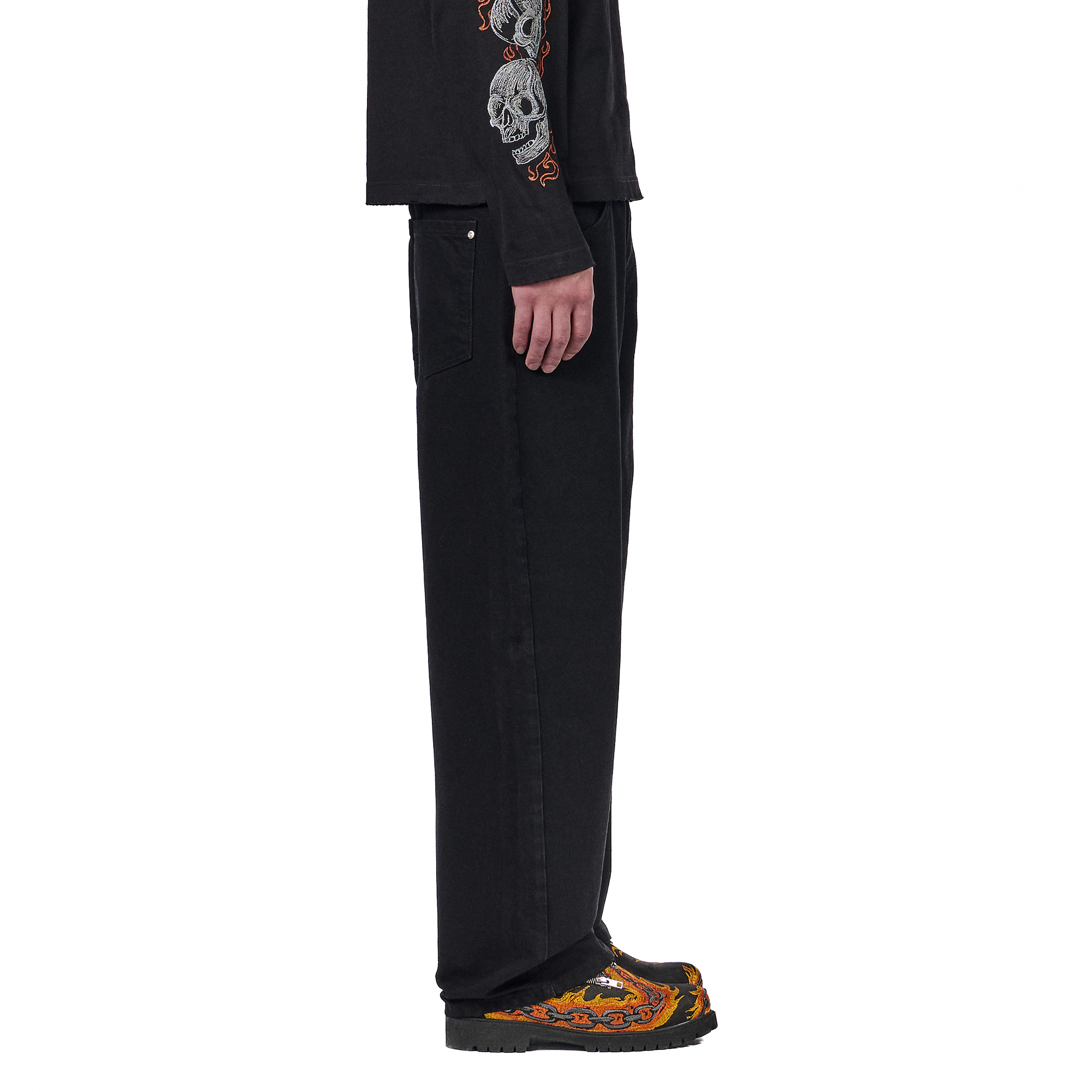 14,5oz denim / 100% cotton / embroidery on left side and front pocket inside / embossed printed leather patch / rhinestone application details on loop / wash inside out / balloon fit / fits true to size