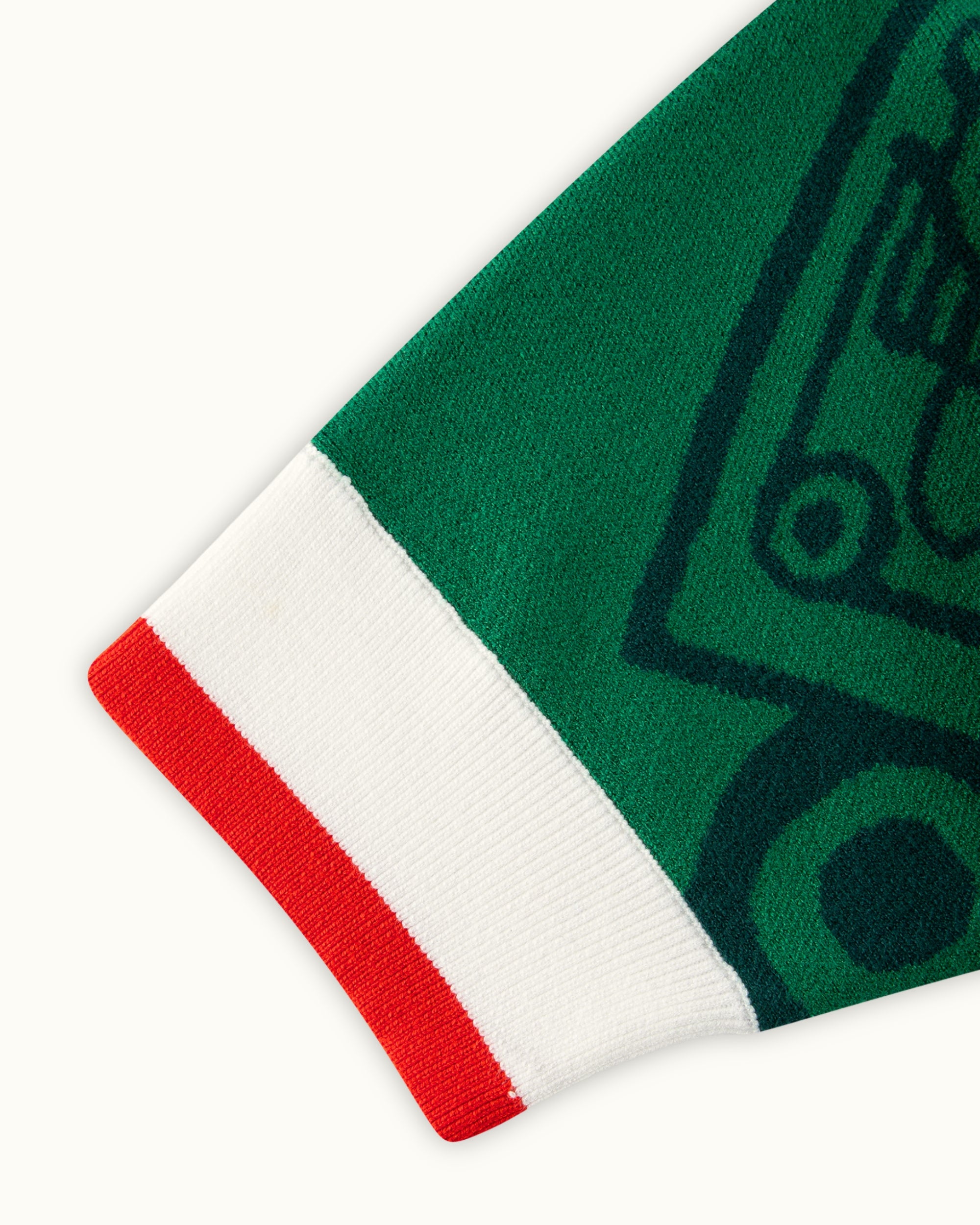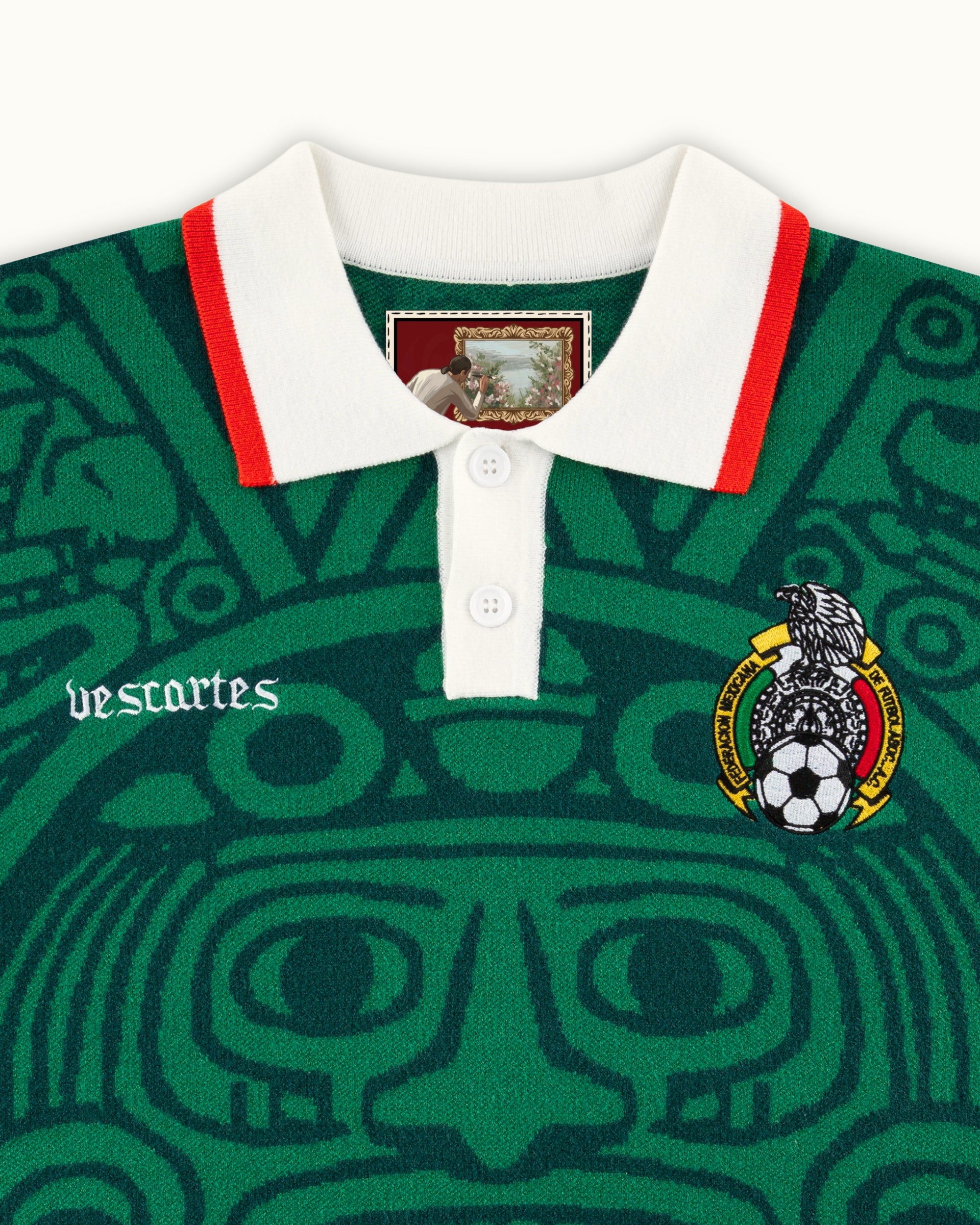 Crafted in a rich emerald green knit, this piece channels the soul of Mexico’s heritage. The jersey features an all-over jacquard Aztec calendar motif — a nod to the 1998 Mexico kit. Finished with contrast red and white accents, and embroidered Vescartes branded chest logos.