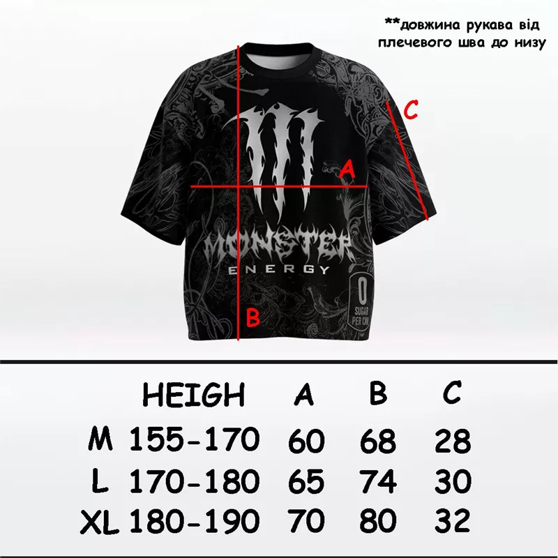material100% polyesterProduct availabilityIn stock"Monster" black t-shirtSizes:M: 155170 cmL: 170180 cmXL: 180+ cmFeatures: Unique oversize fit modern relaxed cut Breathable fabric that keeps its shape and look even after many washesCool and drytechnology makes the garment soft, lightweight, and flexible Prints are applied using sublimation fused into the fabric, not felt to the touch and very durable Perfect for summer comfortable even in hot weather📦 Each item is packed in a zip bag, stickers included as a gift