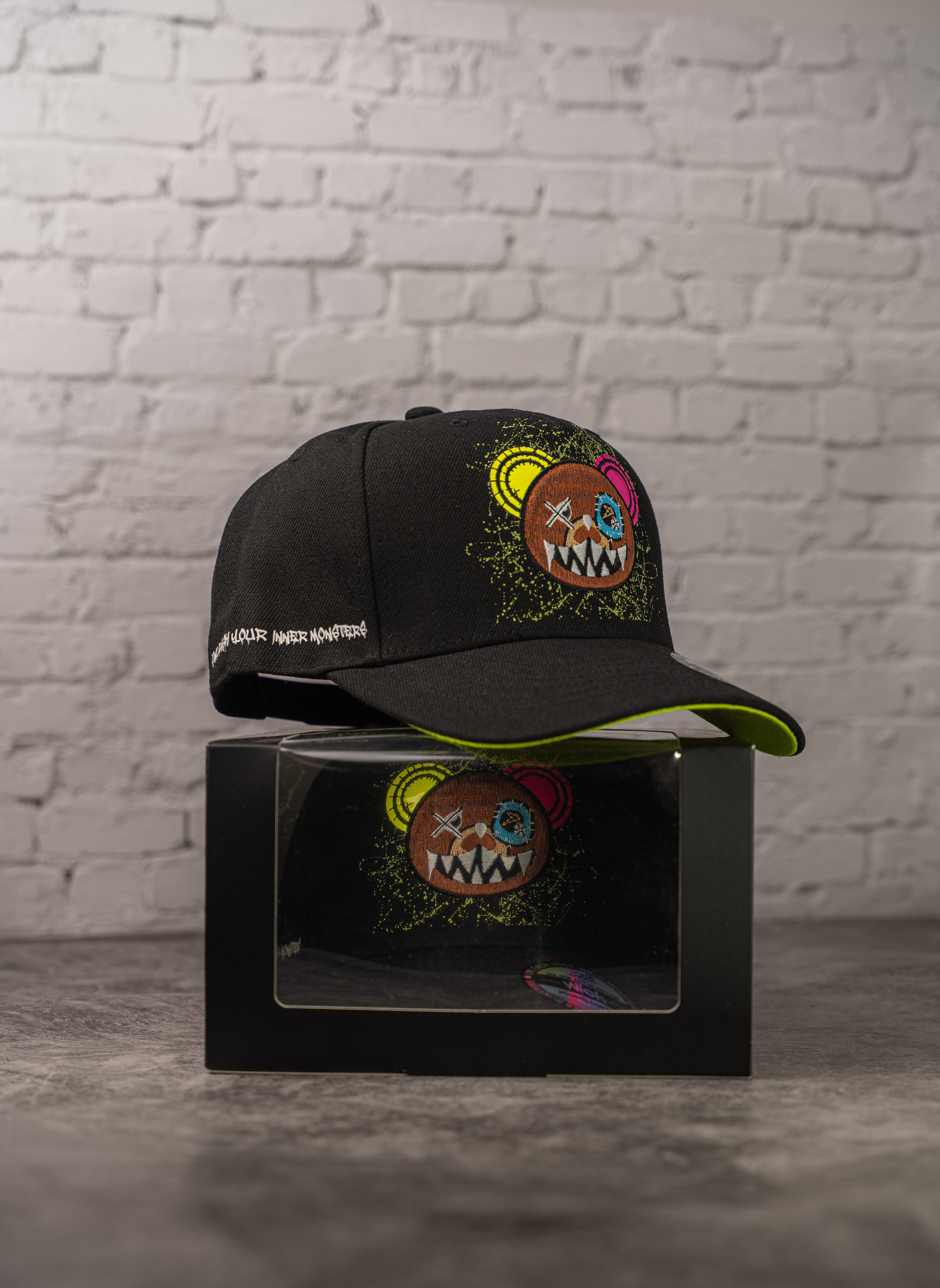 This structured black cap features high-density embroidery of the iconic Wick bear with neon splatter details. Under UV light, the design and logo glow vividly, including the “WK” tag on the side and the underbrim. Crafted for impact both day and night, with a custom Wick sticker, adjustable strap, and standout glow-in-the-dark finishes that bring the monster to life after dark.