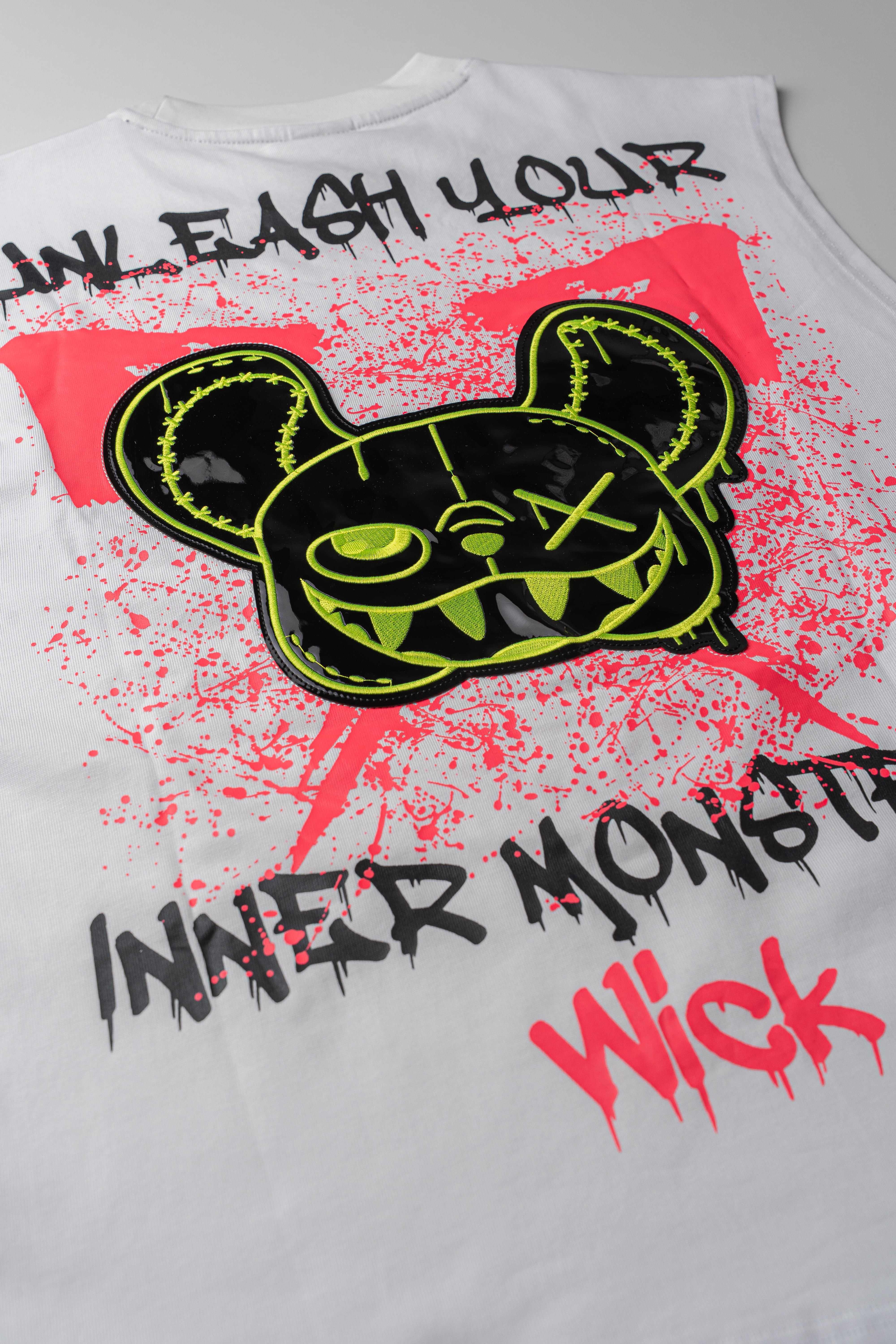 Boom! The Oversized NR Explosion White Pink Tee from Wick Monsters is here to make an explosive entrance. Featuring a neon-stitched monster bear face on the front and a splattered pink graffiti background