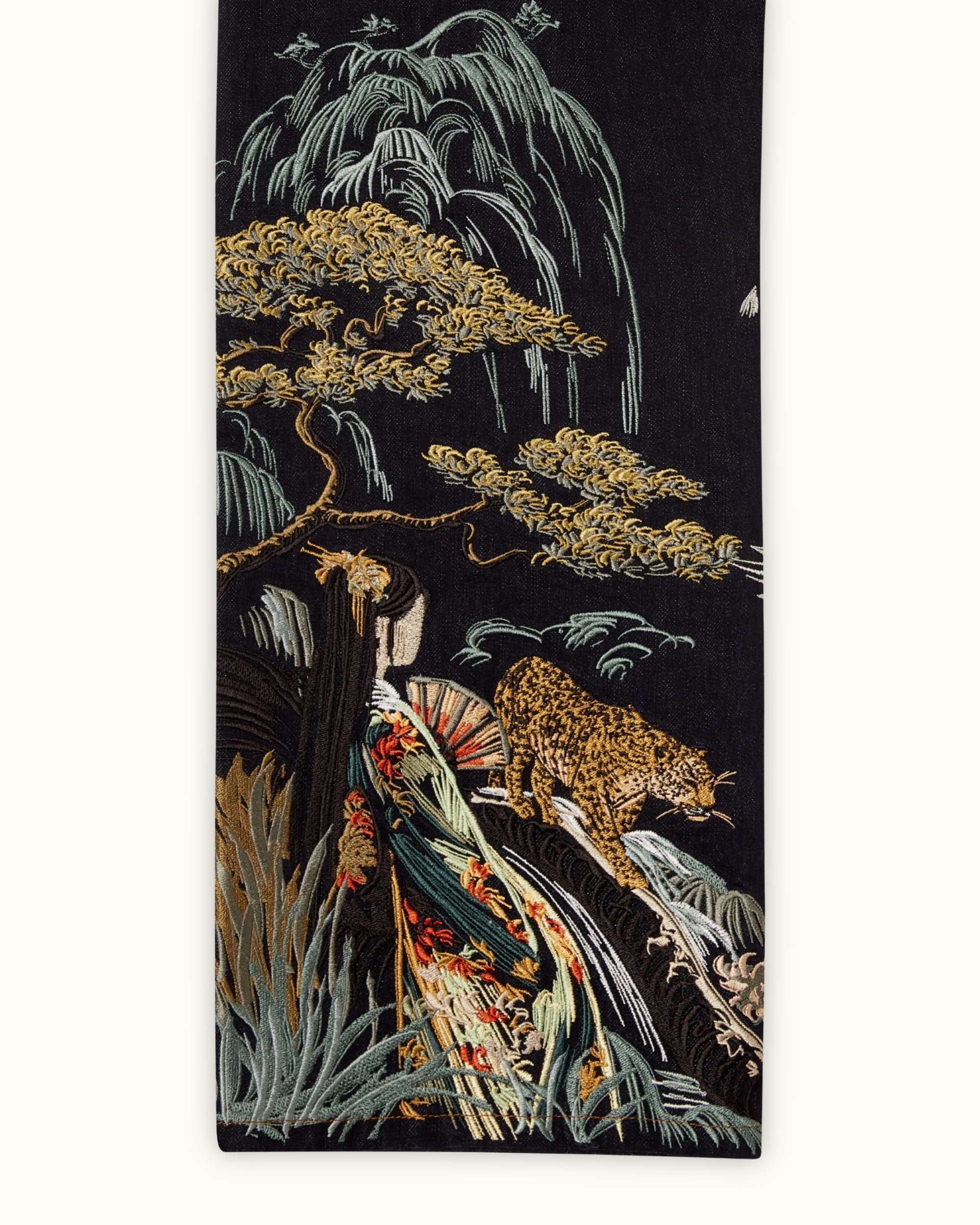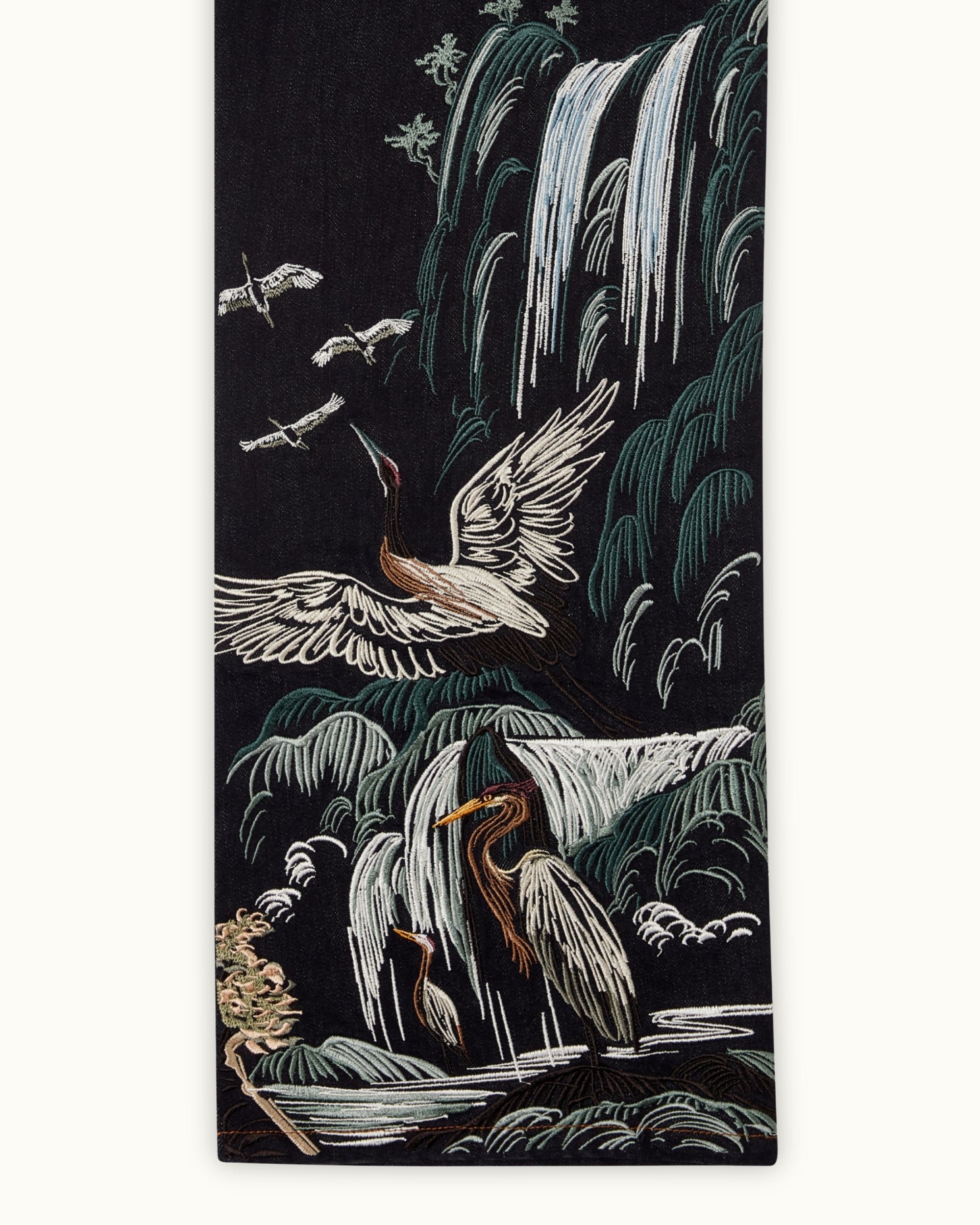 The Tsuru Denim combines a structured silhouette with intricate embroidery across both legs. The artwork unfolds as a continuous landscape, featuring cranes in motion, flowing terrain, and layered natural elements. Built with over 1,000,000 stitches, the composition balances detail with negative space.