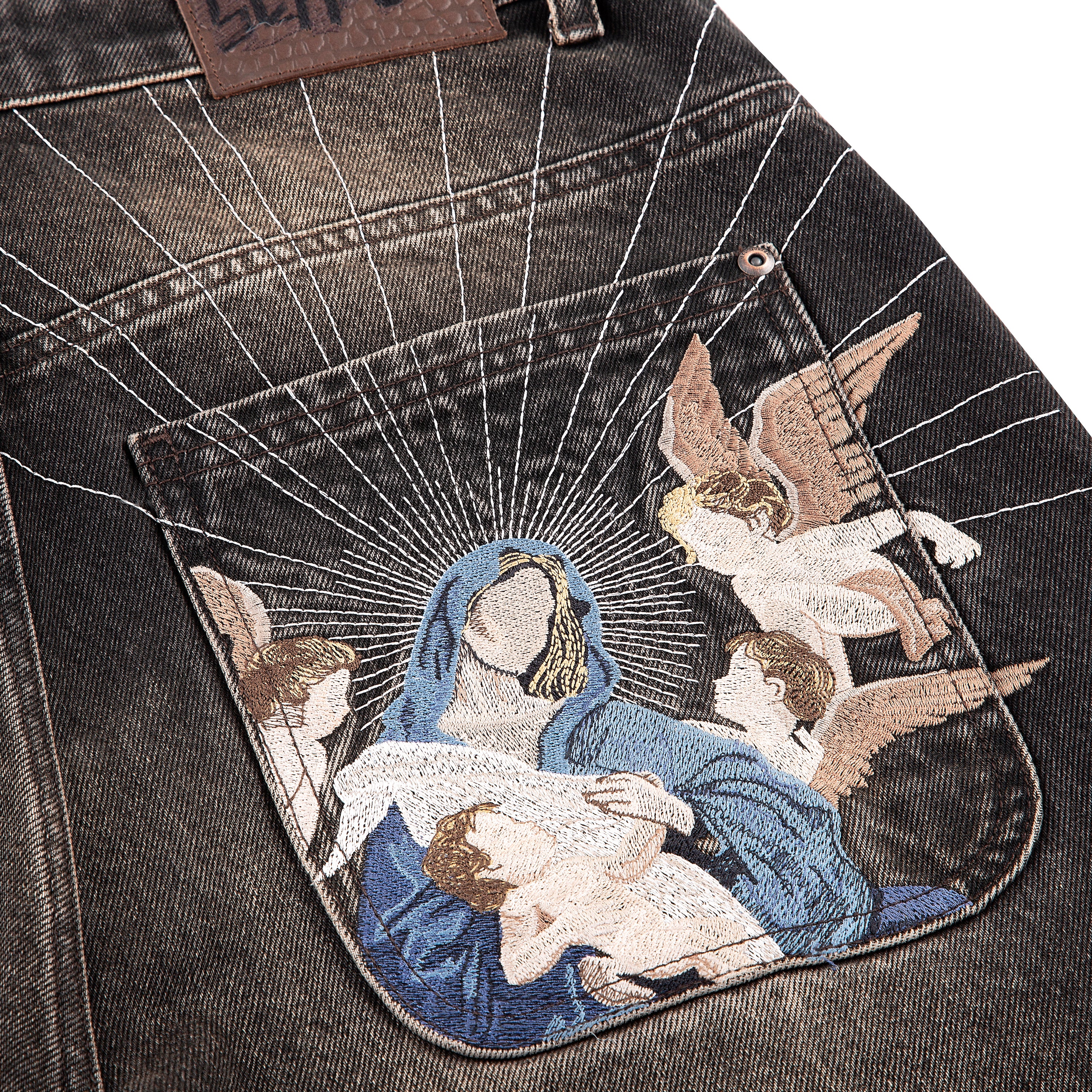 14,5oz denim/ 100% cotton/ embroidery on back/ brown tint/ baggy fit